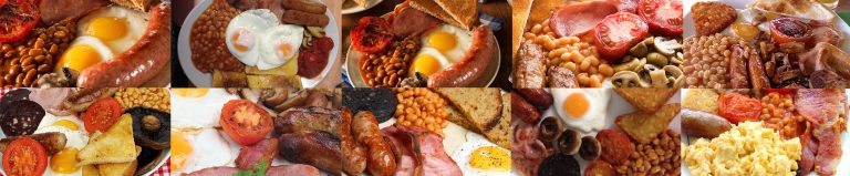 2 Eggs, 2 Sausages, 2 Bacon, Mushrooms, Beans, Tomatoes, Hogs Pudding, Fritters and 2 Fried Slices